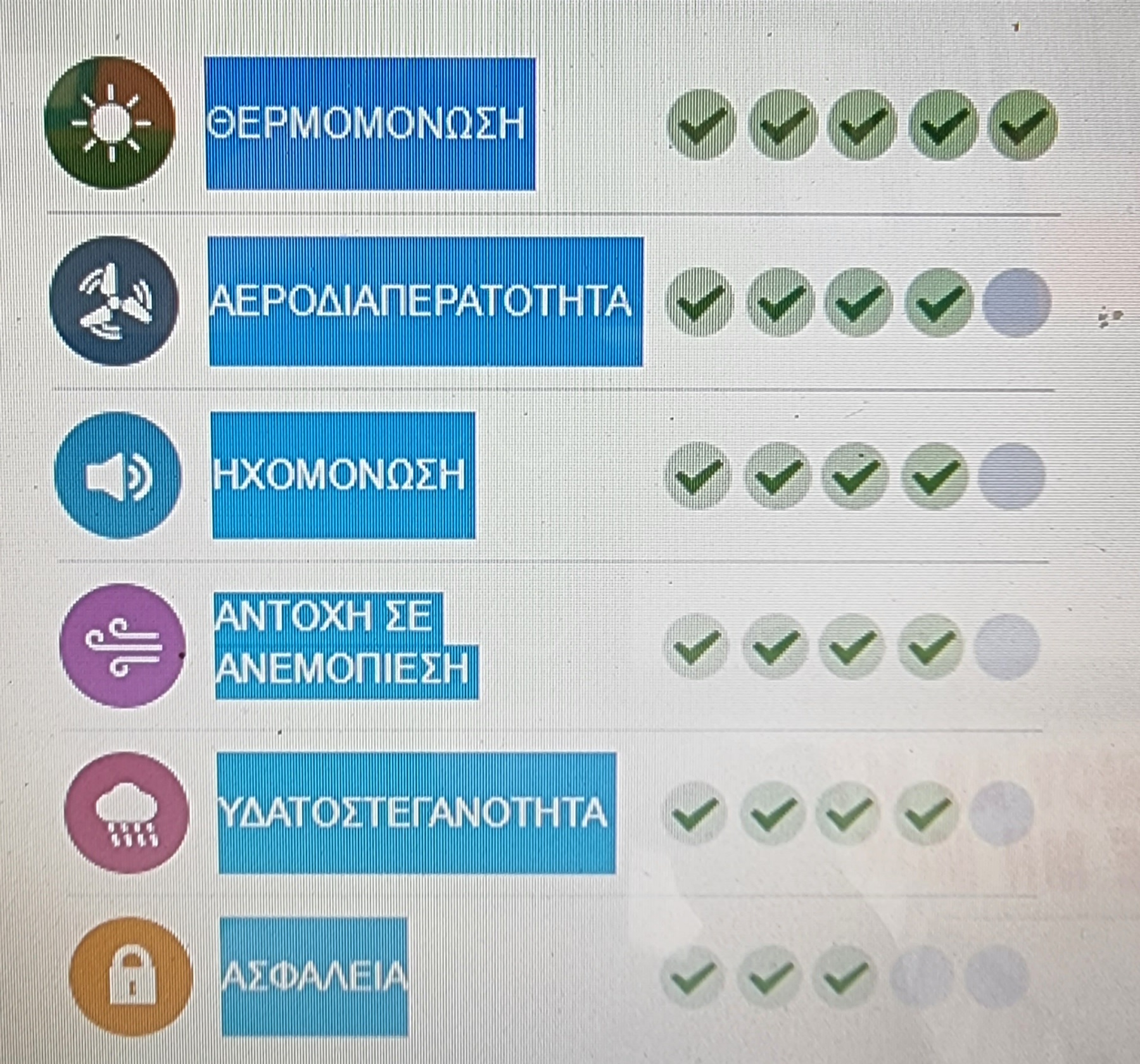 ΠιστοποιητικάQUALICOAT: Πιστοποίηση διαδικασίας ηλεκτροστατικής βαφής IFTRosenheim: Συντελεστής Θερμικής Αγωγιμότητας των προφίλ: Uf=2.5 W/(m² K). Α.Π.Θ.: Δείκτης Ηχομείωσης: Rw(C;Ctr)=40(-2;-6) dB. Roto (Παγκόσμιο Τεχνολογικό Κέντρο): Αντιδιαρρηκτική Πιστοποίηση WK2.